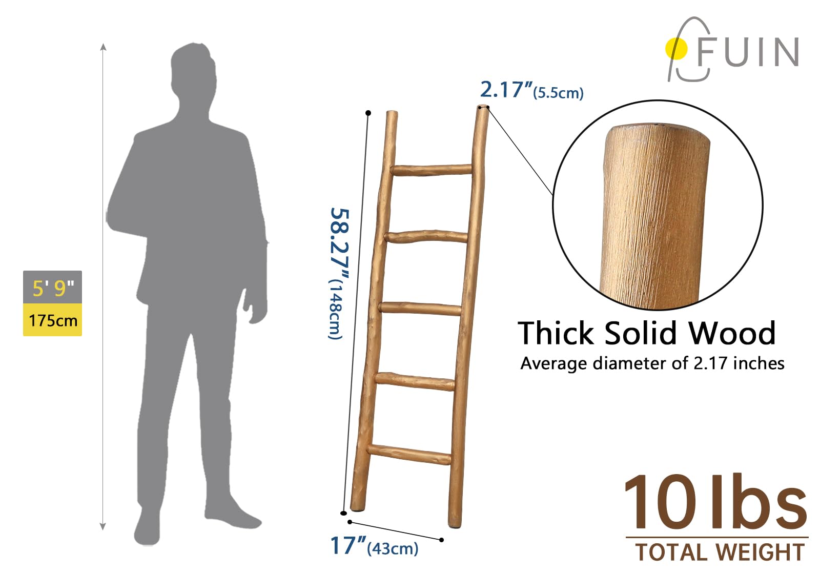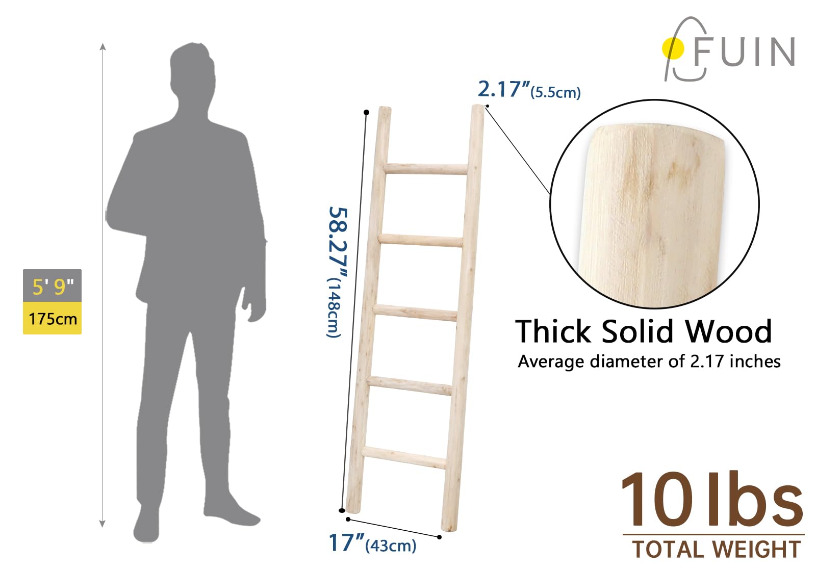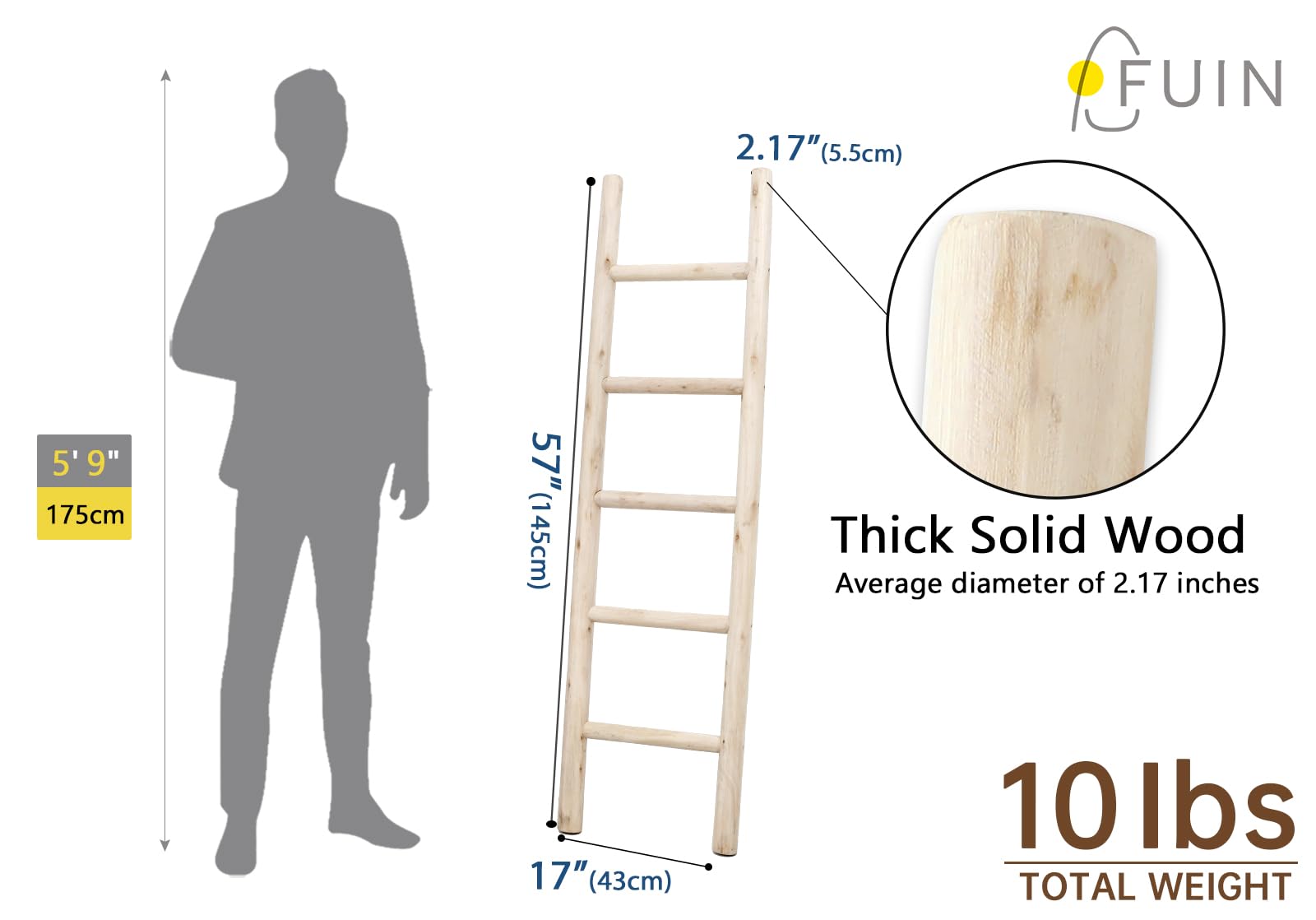 FUIN Fully Assembled 57in Wood Blanket Ladder Living Room Decorative Wall Leaning Farmhouse Quilt Display Holder Rustic Wooden Towel Rack for Bathroom, Unfinished