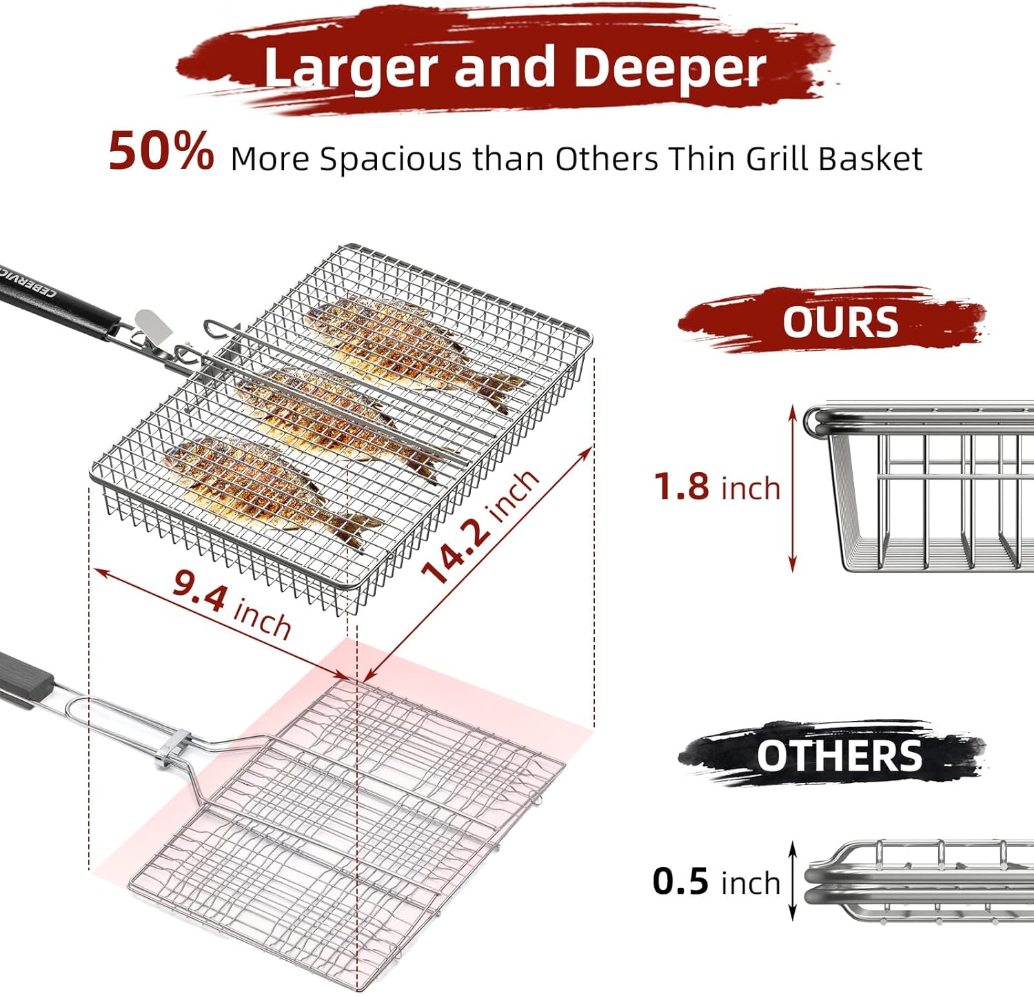 - LARGER COOKING SURFACE: The grill basket provides a generous cooking surface of 14.2 x 9.4 x 1.8 in to accommodate foods for 2-4 people, which is larger than other market grill baskets, It's ideal for grilling whole fish, vegetables, thick burgers, steaks, seafood, meat, shrimp, and so on.
