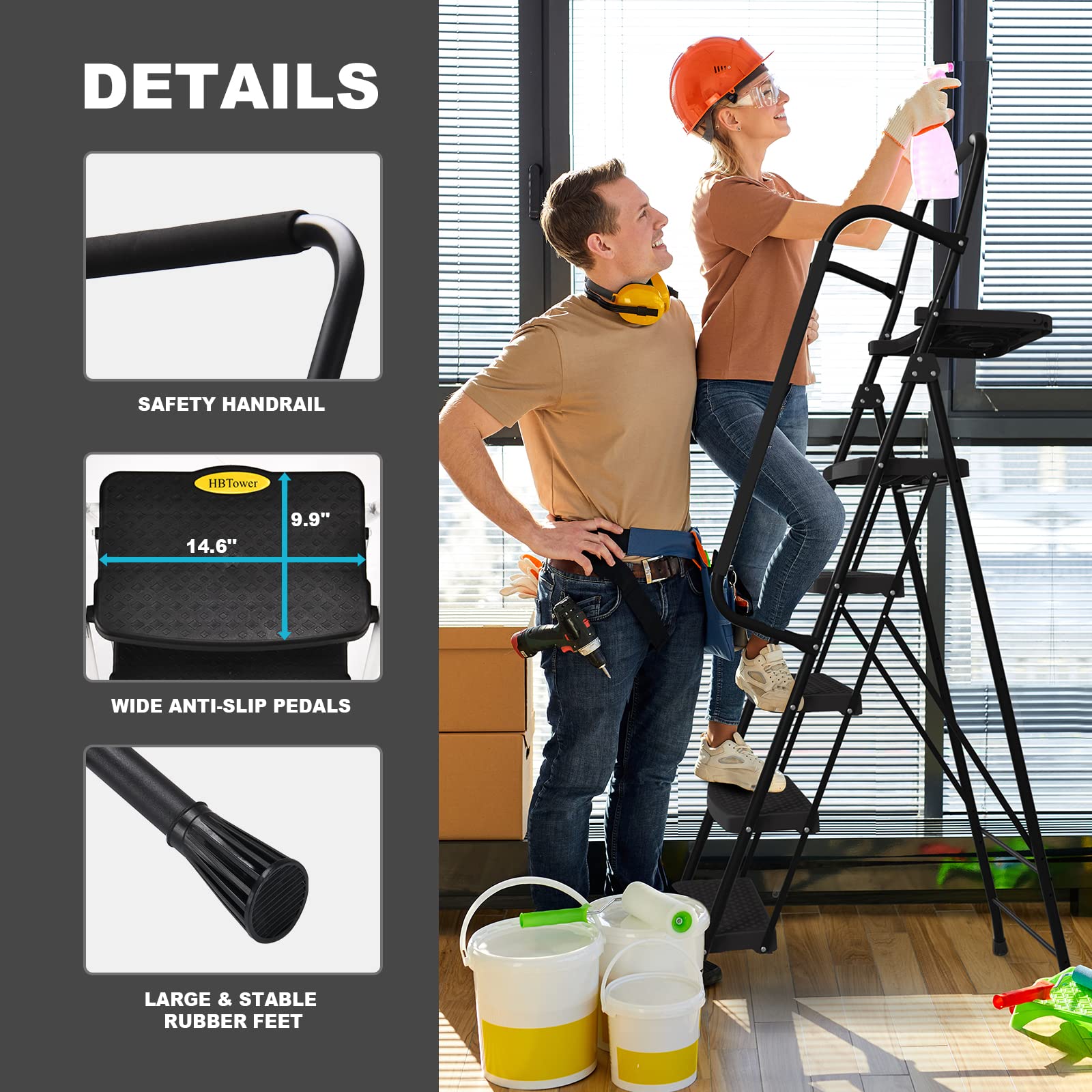 HBTower Step Ladder, Folding Step Stool with Wide Anti-Slip Pedal, Sturdy Steel Ladder, Convenient Handrail, Lightweight, Portable Steel Step Stool