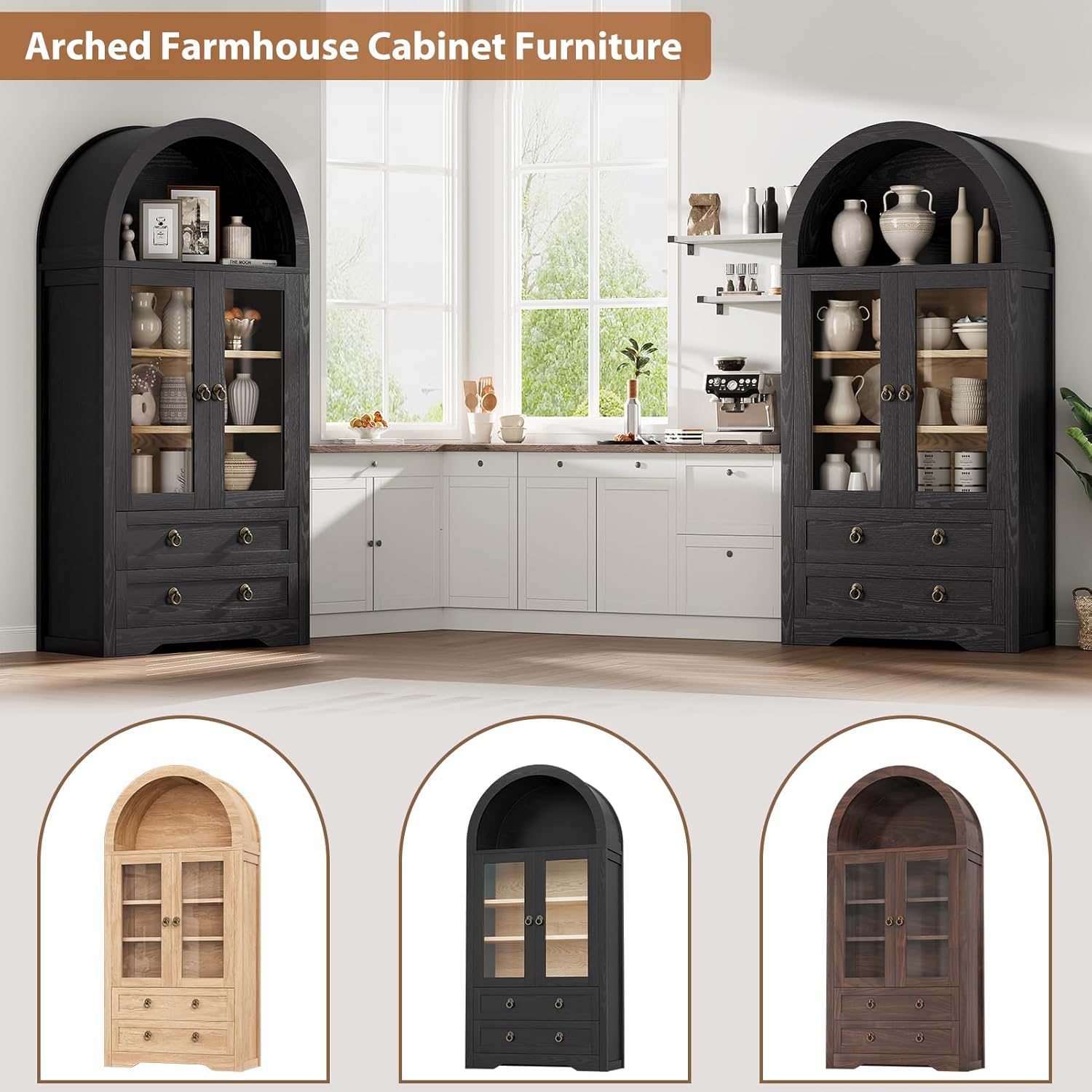 - MULTI-PURPOSE STORAGE/DECOR:As pantry cabinet,or kitchen cabinet, china cabinet, or arched bookshelf—use it as a pantry in the kitchen, a display shelf in the living room, or a stylish organizer in the home office. The storage cabinet with doors and shelves offer easy access while protecting items from dust. With its elegant arch and premium materials, it’s the perfect blend of style and practicality for any home.