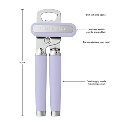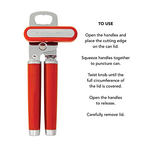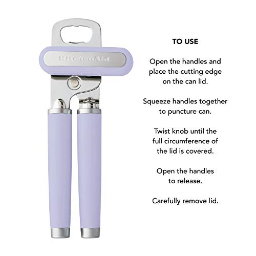 Open any sized can or bottle with the KitchenAid Classic Can Opener. The durable, razor-sharp stainless steel cutting wheel easily pierces and smoothly slices through cans, while the large knob provides a secure grip for effortless turning. The oversized, ergonomic handles provide maximum comfort and control for simple, safe use. This 2-in-1 tool features an integrated bottle opener to remove caps with ease. Hand wash with warm water and a mild detergent; rinse and dry immediately. One year hassle-free replacement and lifetime limited warranty.