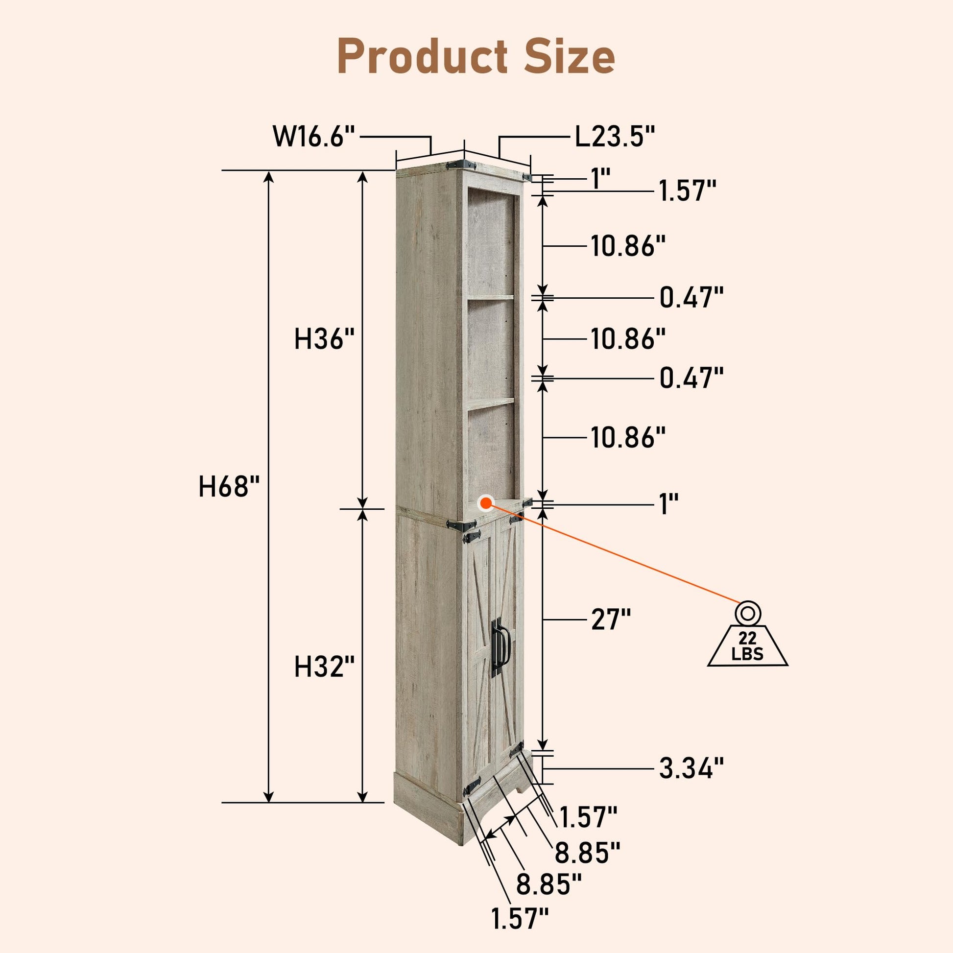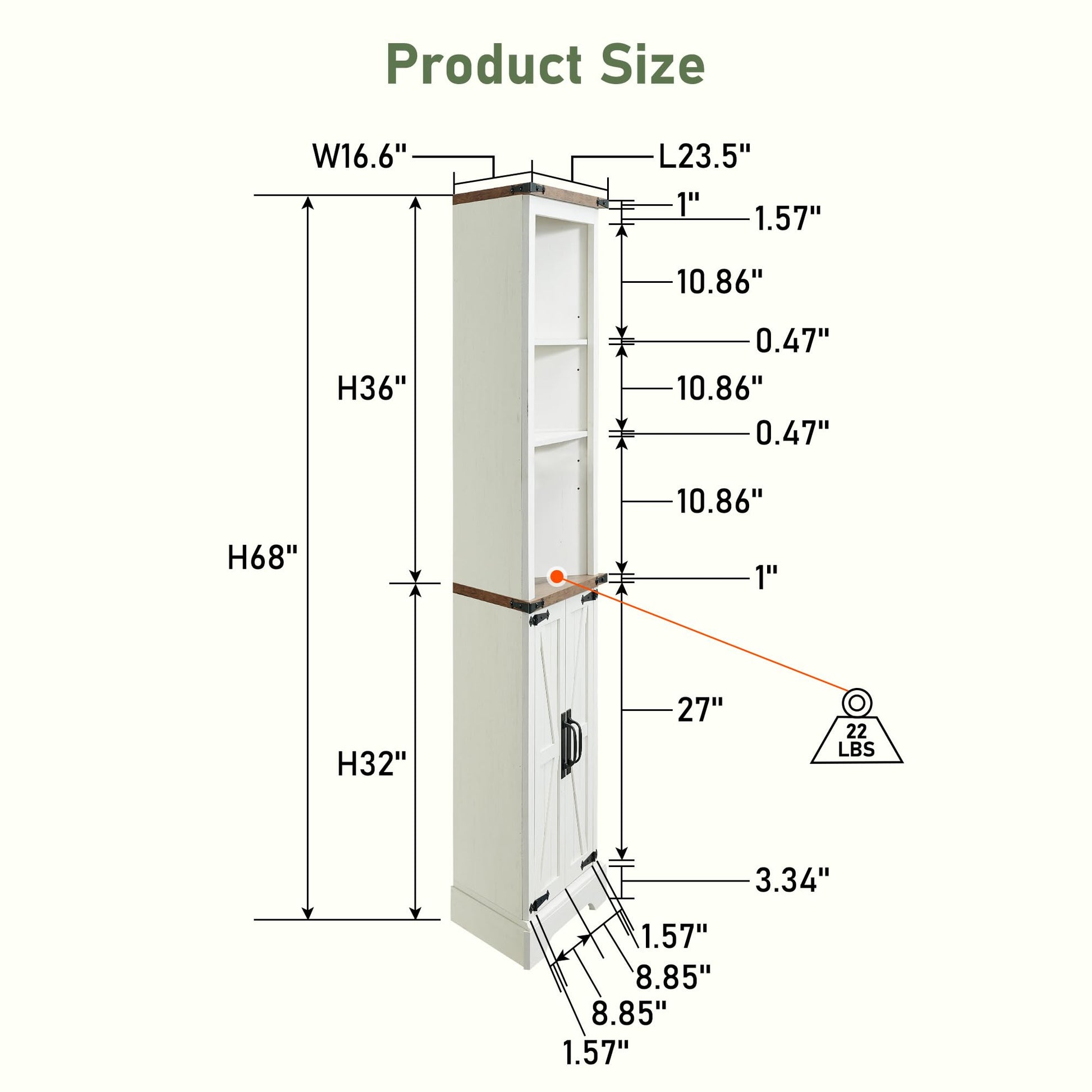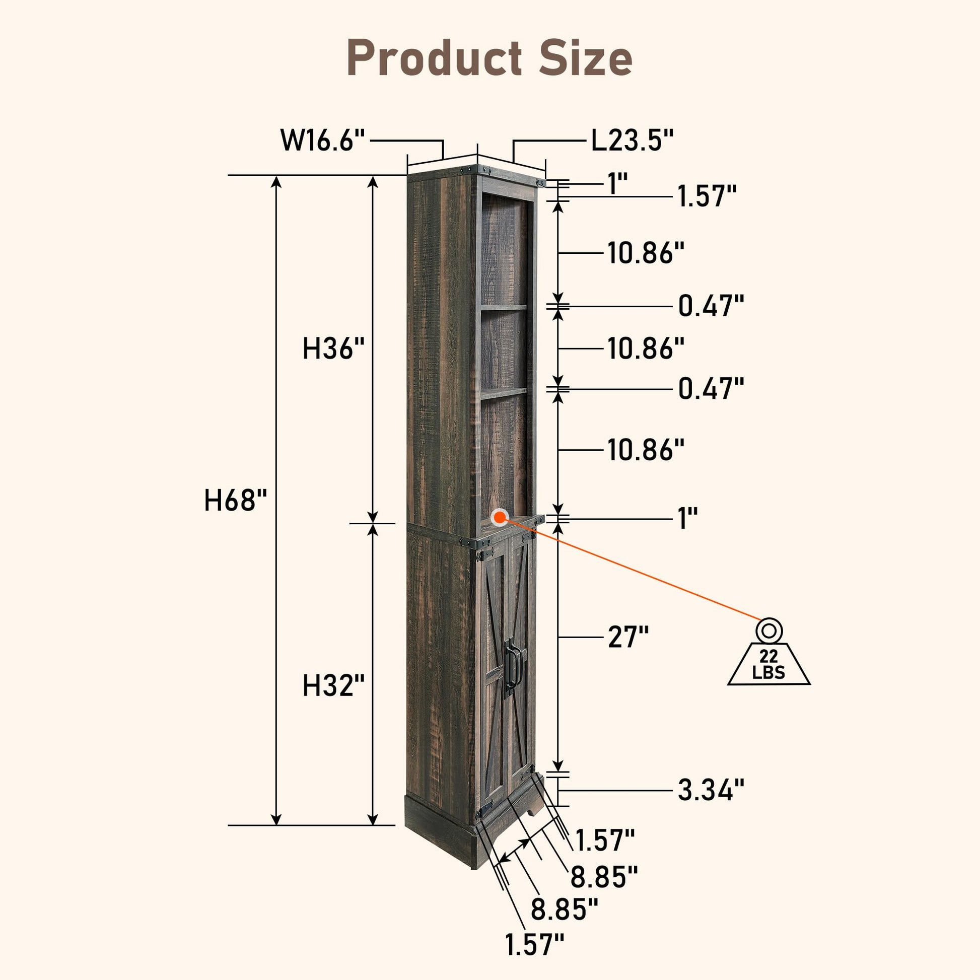 - [CUSTOMIZED STORAGE SPACE] 23.5"L × 12"W × 68"H, This cabinet has storage aplenty that could make the most of those underutilized corners. Three adjustable shelves, two open and one inside the cabinet give you much need space to store whatever your heart desires, keeping the space clear of any clutter
