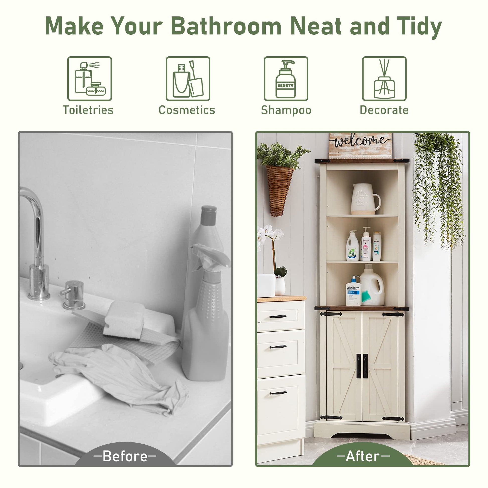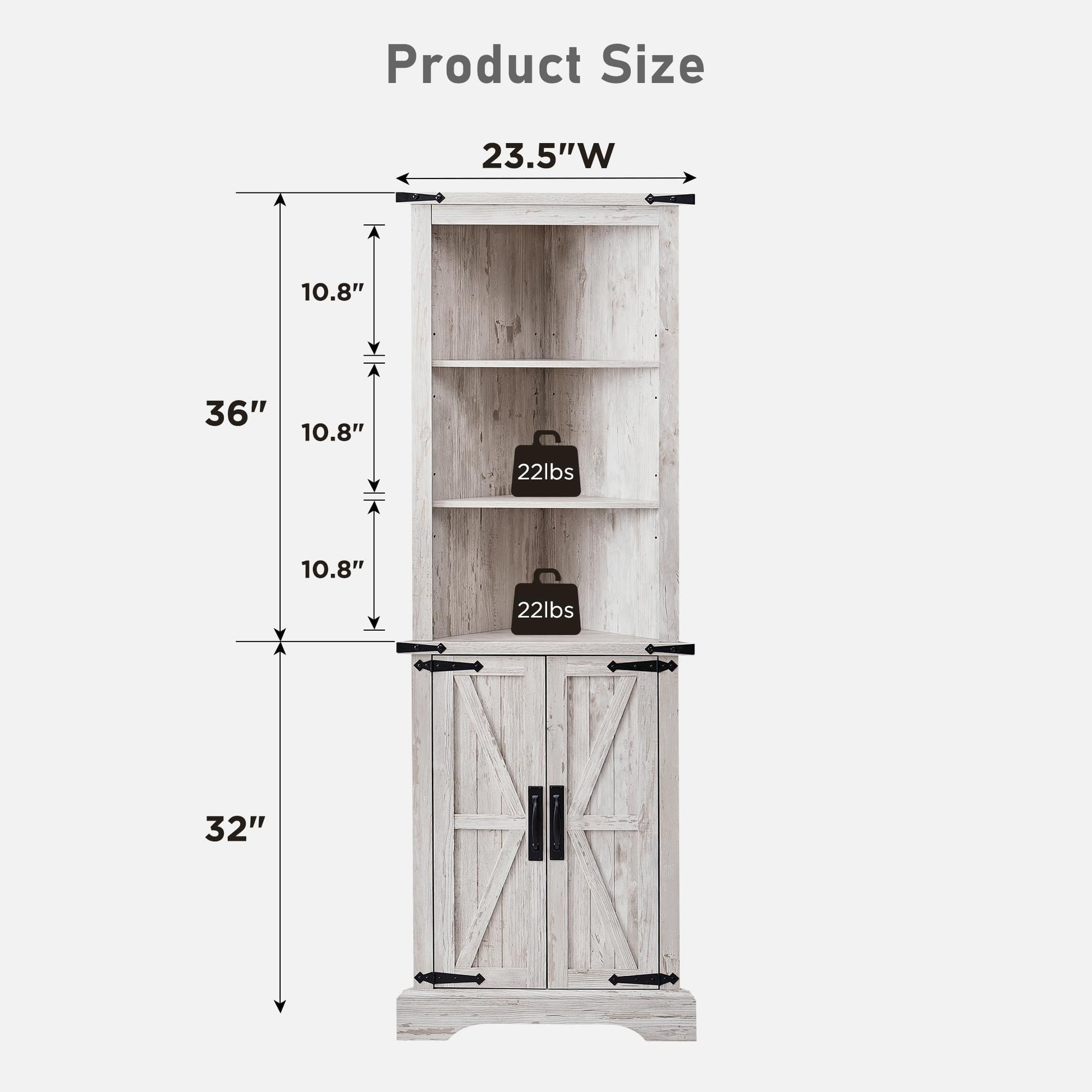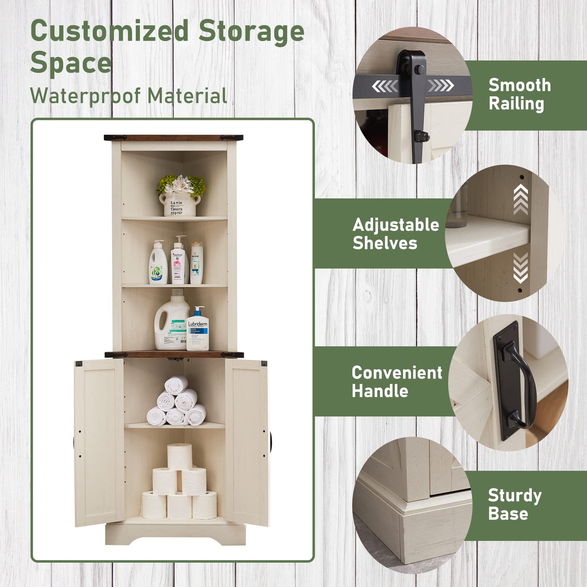 OKD Tall Corner Cabinet, Farmhouse Storage Cabinet with Barn Door Design & Adjustable Shelves, Home Space Saver for Bathroom, Living Room, Rustic Oak with Antique White
