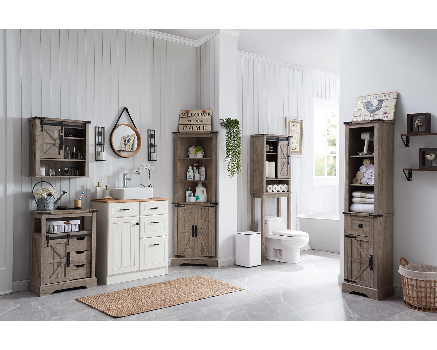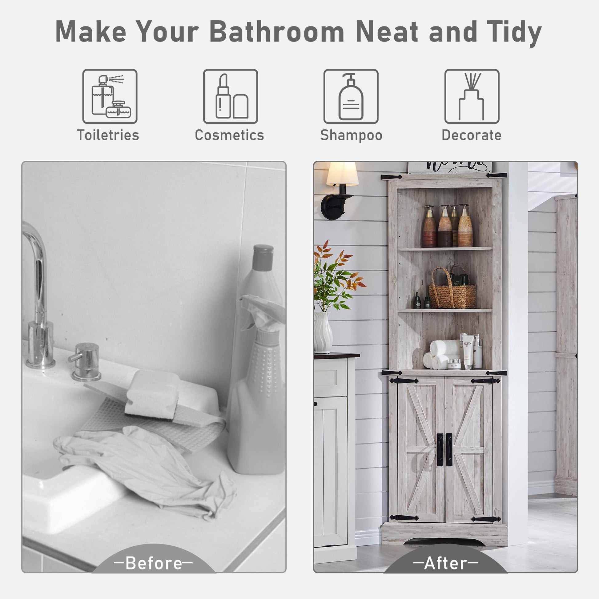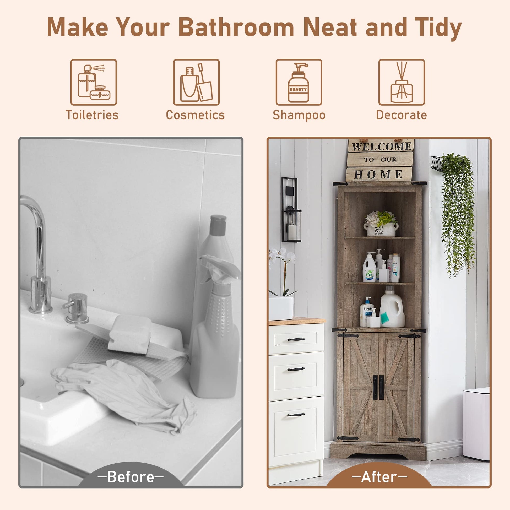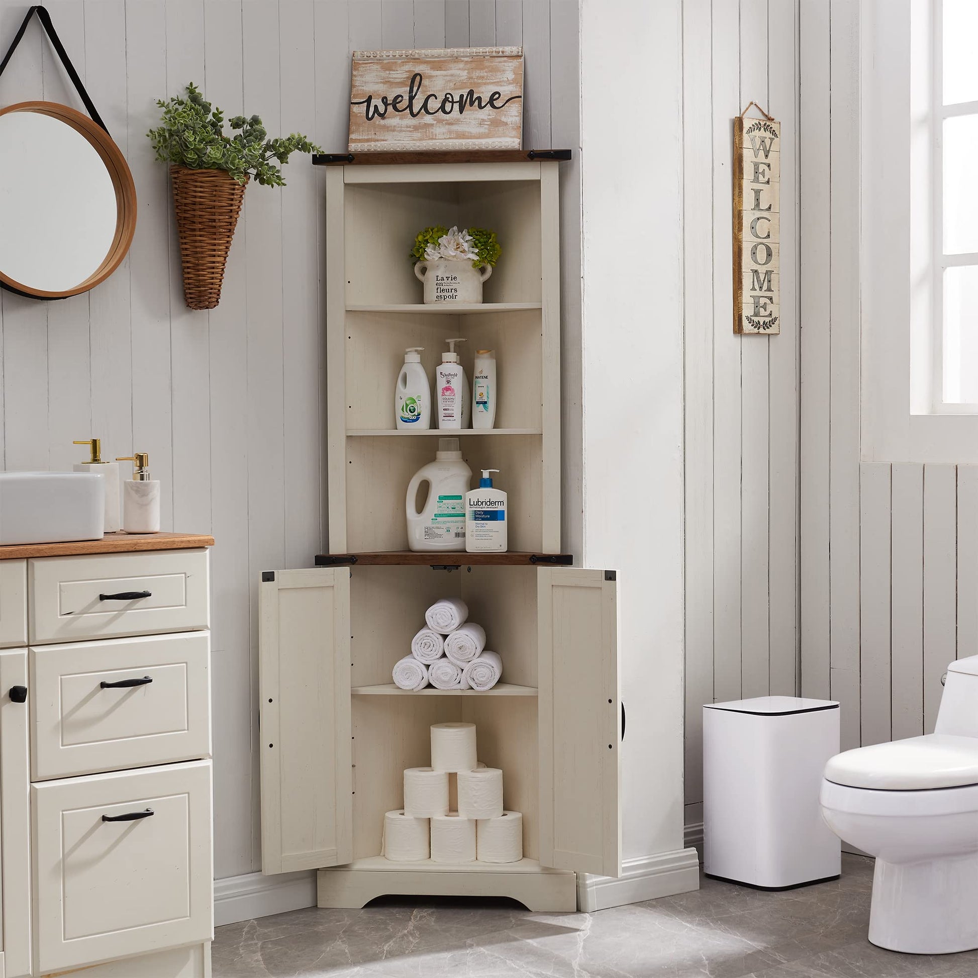 OKD Tall Corner Cabinet, Farmhouse Storage Cabinet with Barn Door Design & Adjustable Shelves, Home Space Saver for Bathroom, Living Room, Rustic Oak with Antique White