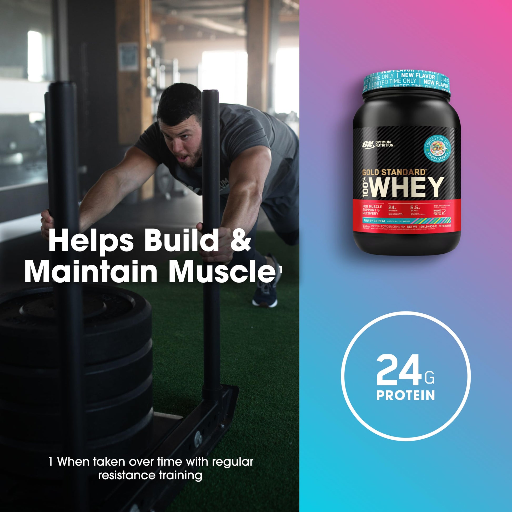 - Gold Standard 100% Whey - 24g of protein per serving to help build and maintain muscle when taken over time with regular resistance training