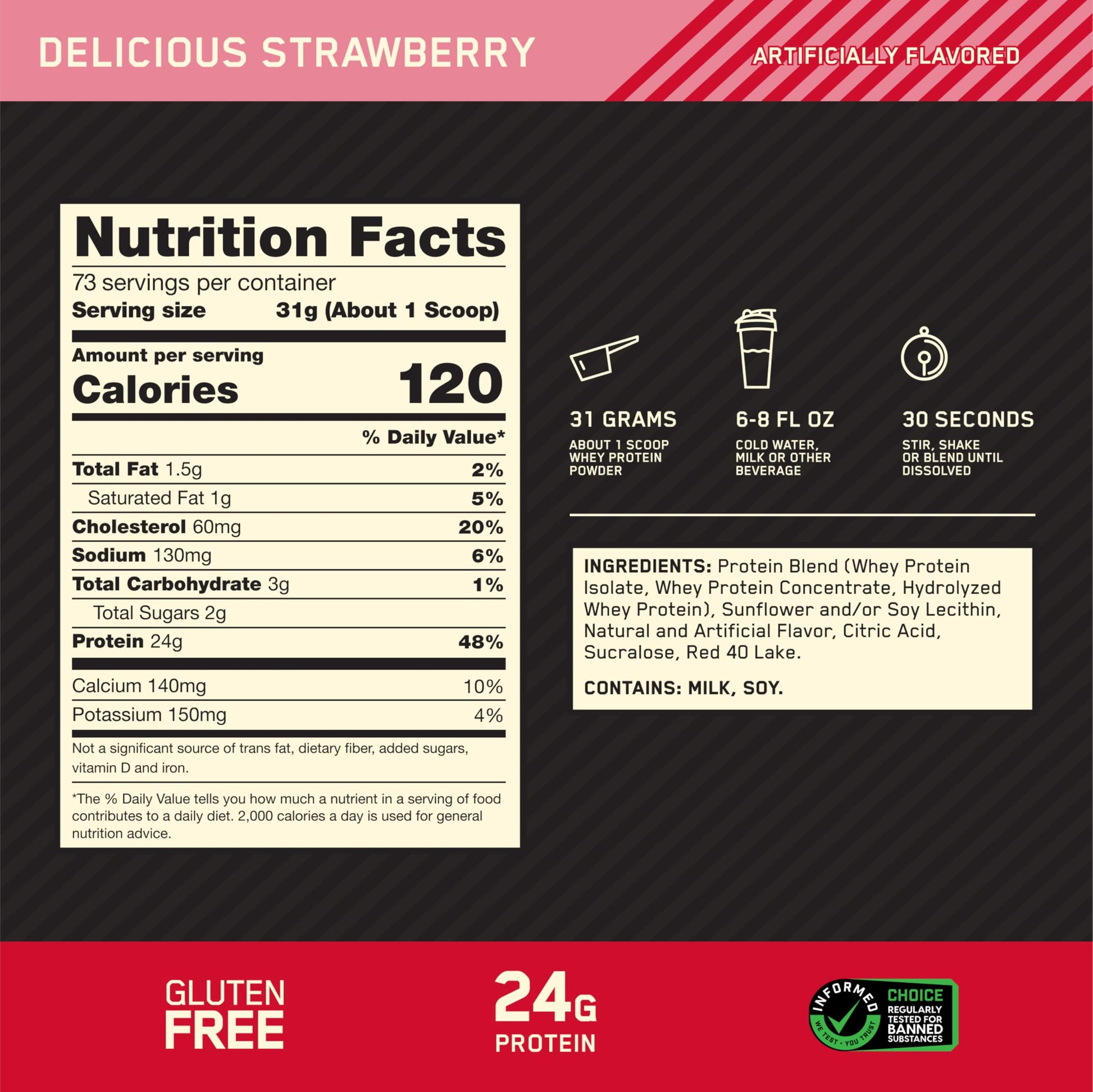 OPTIMUM NUTRITION'S GOLD STANDARD 100% Whey uses pure Whey Protein Isolates as the primary ingredient. Combined with ultra-filtered whey protein concentrate, each serving provides 24 grams of all-whey protein and 5.5 grams of naturally occurring Branched Chain Amino Acids (BCAAs) which are prized by athletes for their muscle building qualities. With more than 20 tempting flavors to choose from, ON GOLD STANDARD 100% Whey gives you plenty of ways to keep workout recovery interesting.