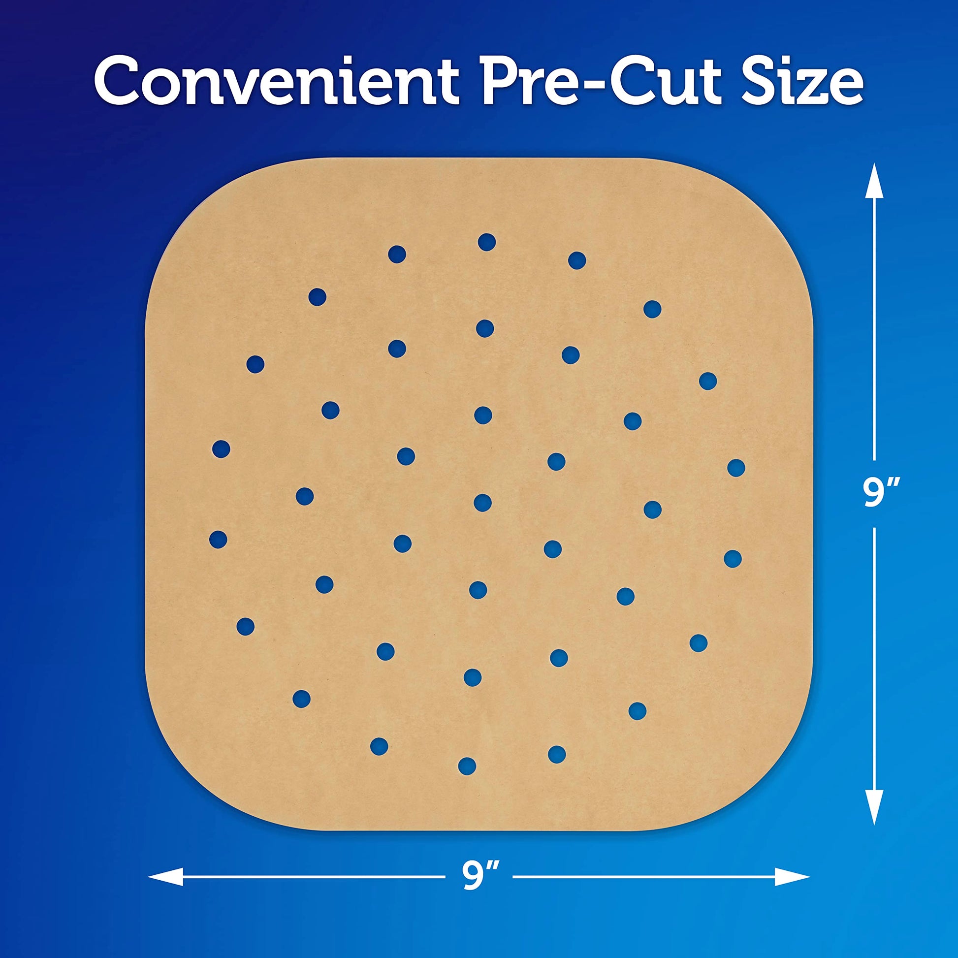 - REYNOLDS AIR FRYER LINERS: Contains one pack of 50 pre-cut Reynolds Kitchens Air Fryer Liners, each liner measuring 9 inches by 9 inches