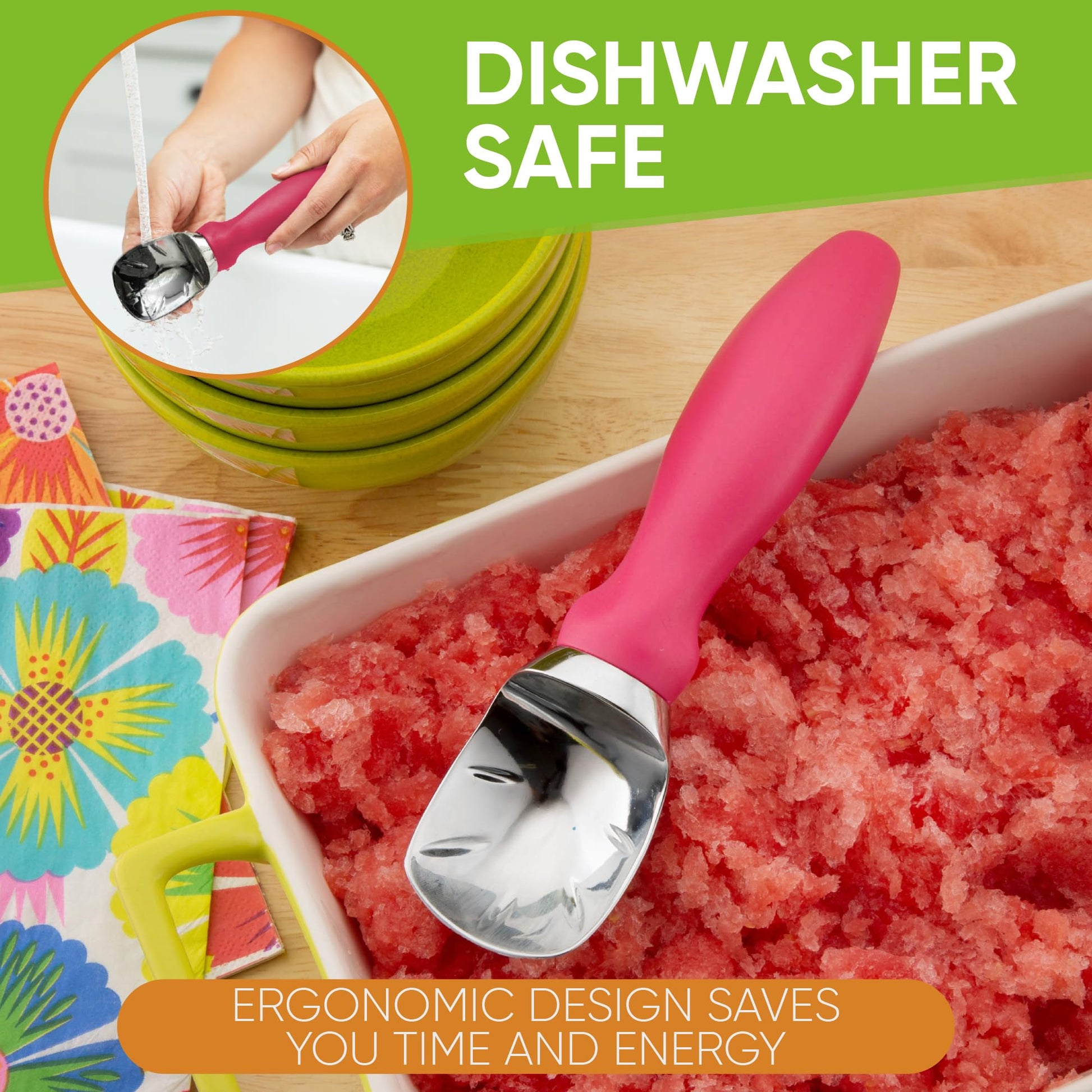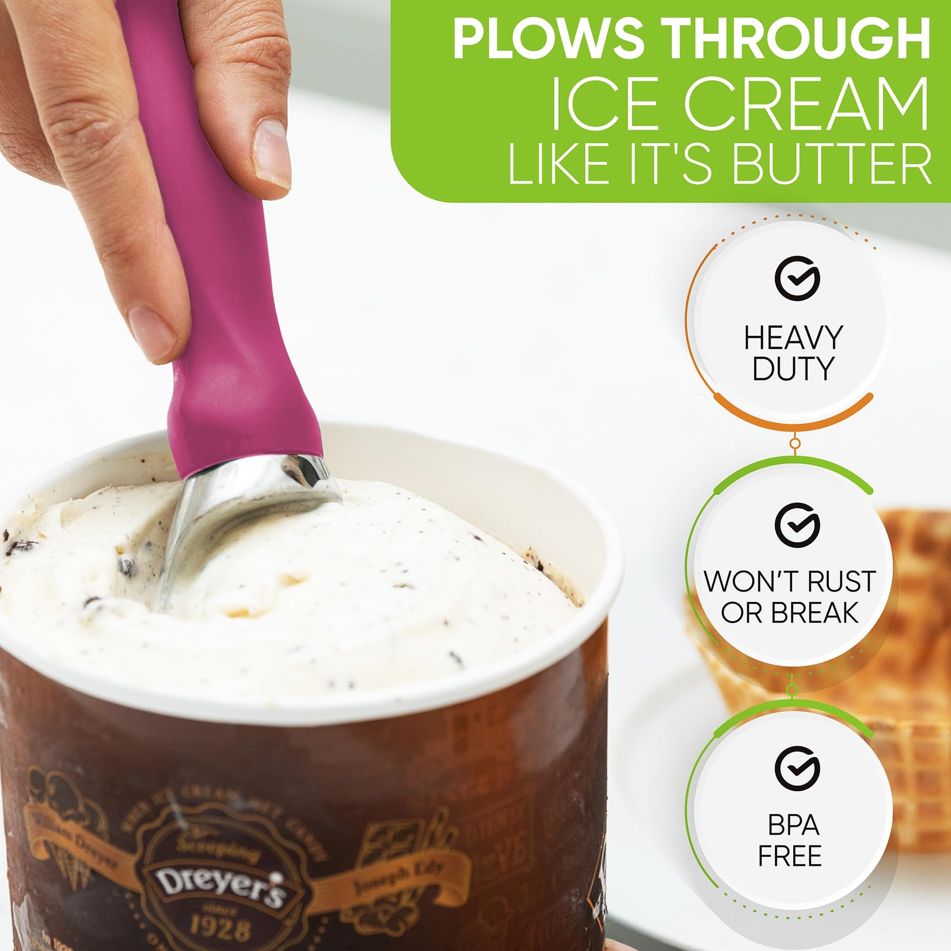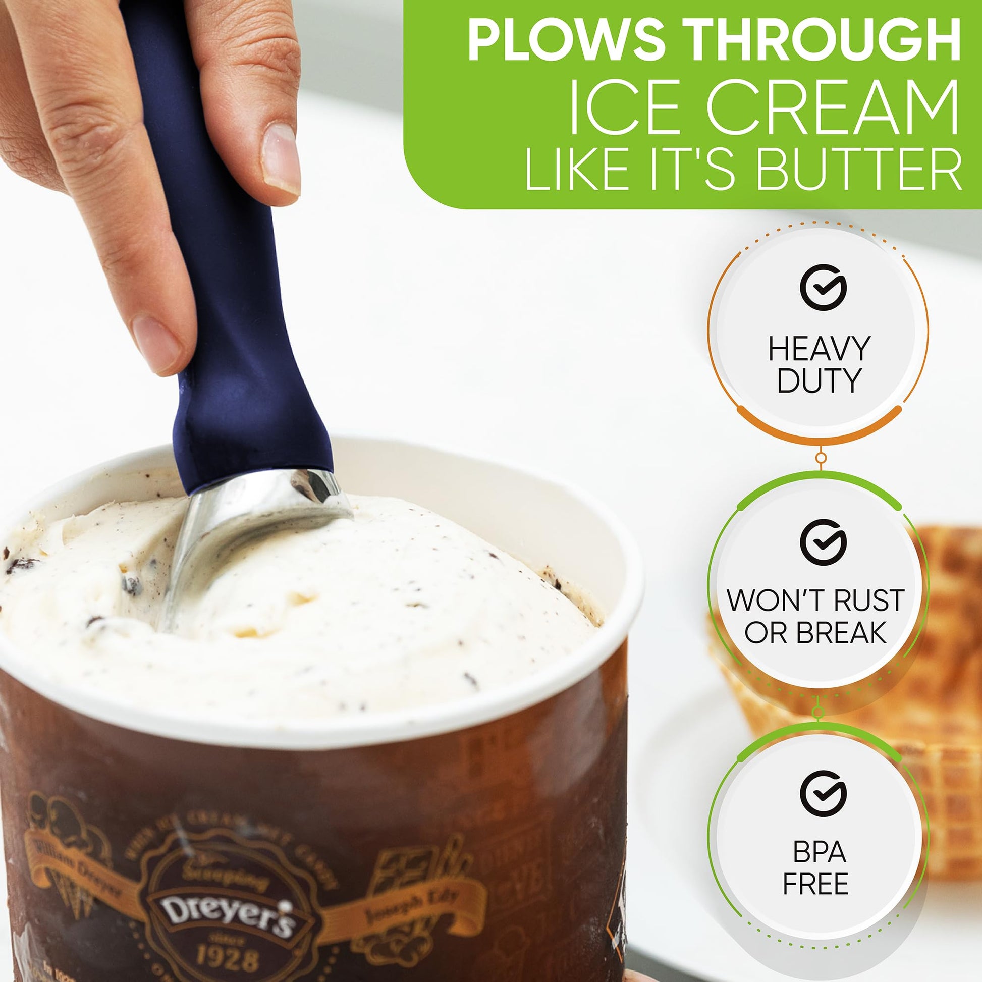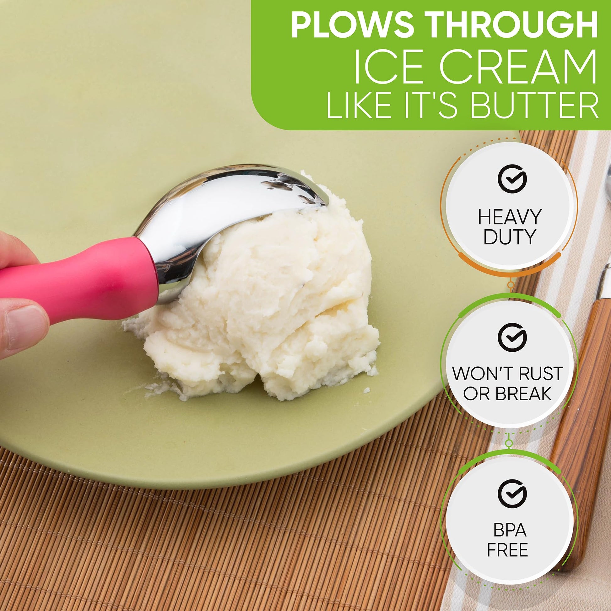 - PLOWS THROUGH ICE CREAM LIKE IT'S BUTTER - Glides smoothly and easily through hard-packed frozen sweets. It will seem like ice cream flows right into the ice cream scoops and drops into your bowl or cone with little to no effort.