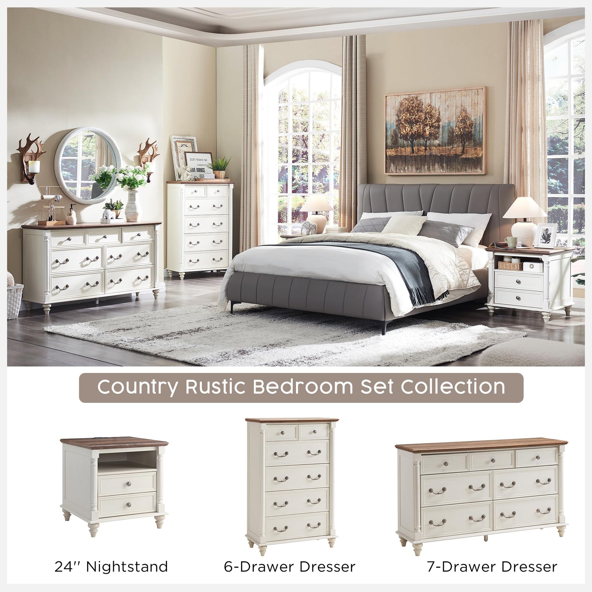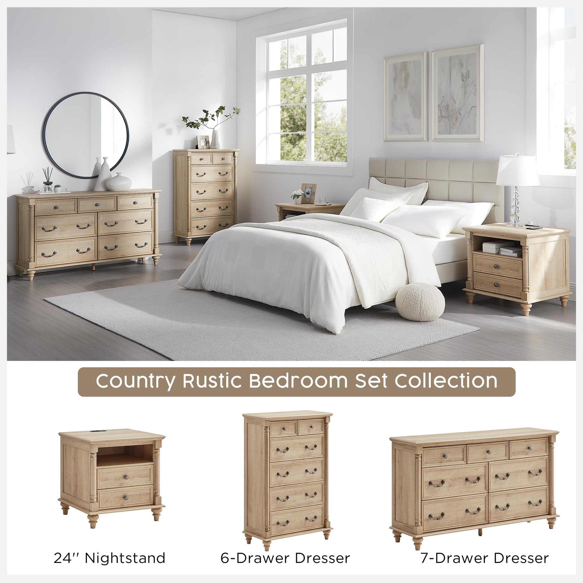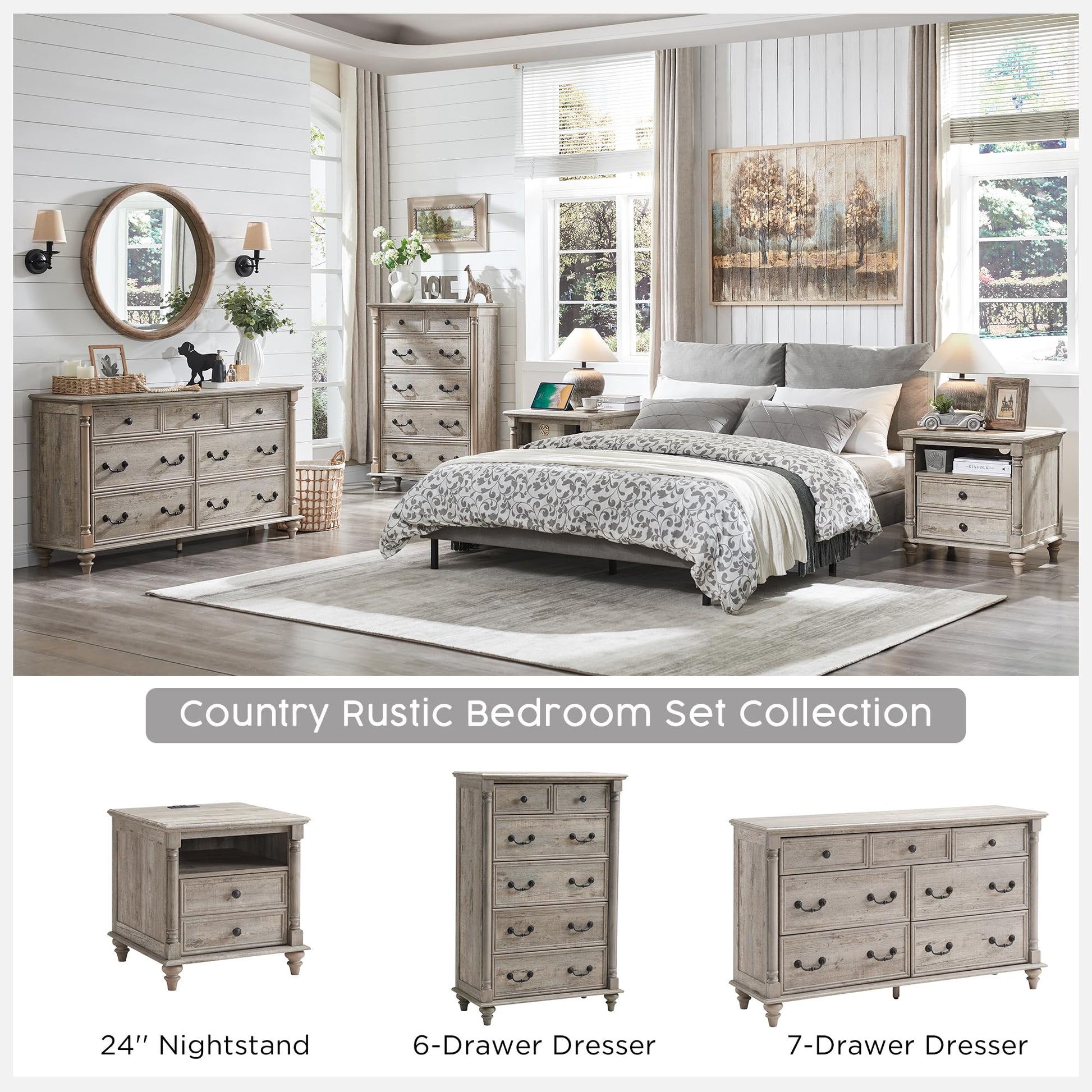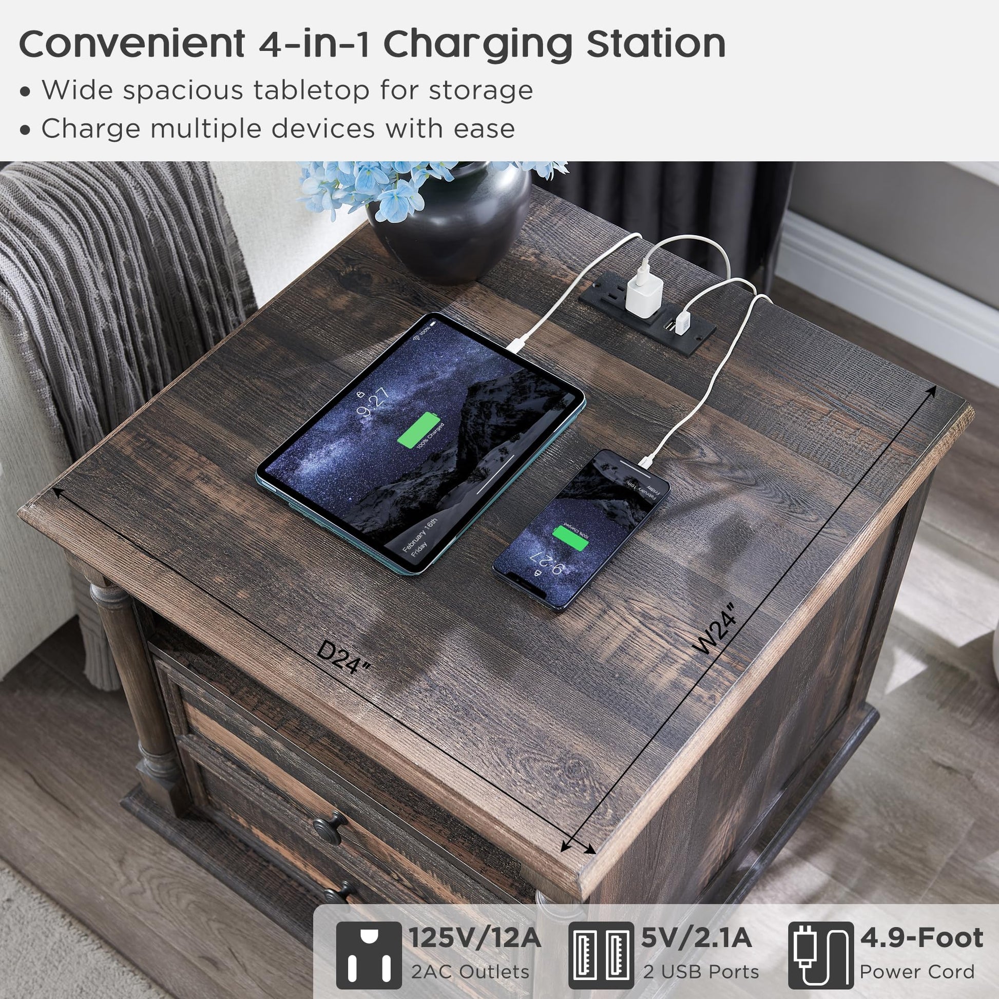 - EXQUISITELY CRAFTED: Measuring 24''W* 24'' D *24'' H. With an antiqued two-tone wood grain that stands out against the distressed finish, this transitional nightstand brings a warm presence to your bedroom/living room. Beautified with 4 solid wood feet & and the solid wood column decor which is wonderfully easy on the eyes. Paired with the unique antique-tone pulls and recessed 4-in-i charging station on the tabletop, made for years of satisfaction.
