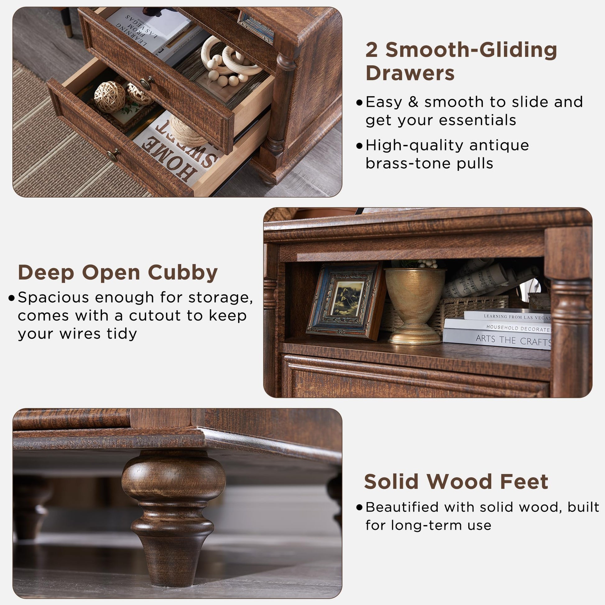 - YOUR BEDSIDE/SOFA TABLE SOLUTION: Two smooth-gliding drawers plus a spacious semi-open deep cubby offer ample storage for your essentials while the built-in ports (2 Standard AC Outlets and 2 USB ports) make charging devices a breeze. Spacious 24'' *24'' tabletop, this design effortlessly accommodates your lamp, laptop, and various daily essentials ensuring clutter-free without any sense of crowding. The semi-open cubby comes with a 2.3'''' round cutout at the back for organizing cords