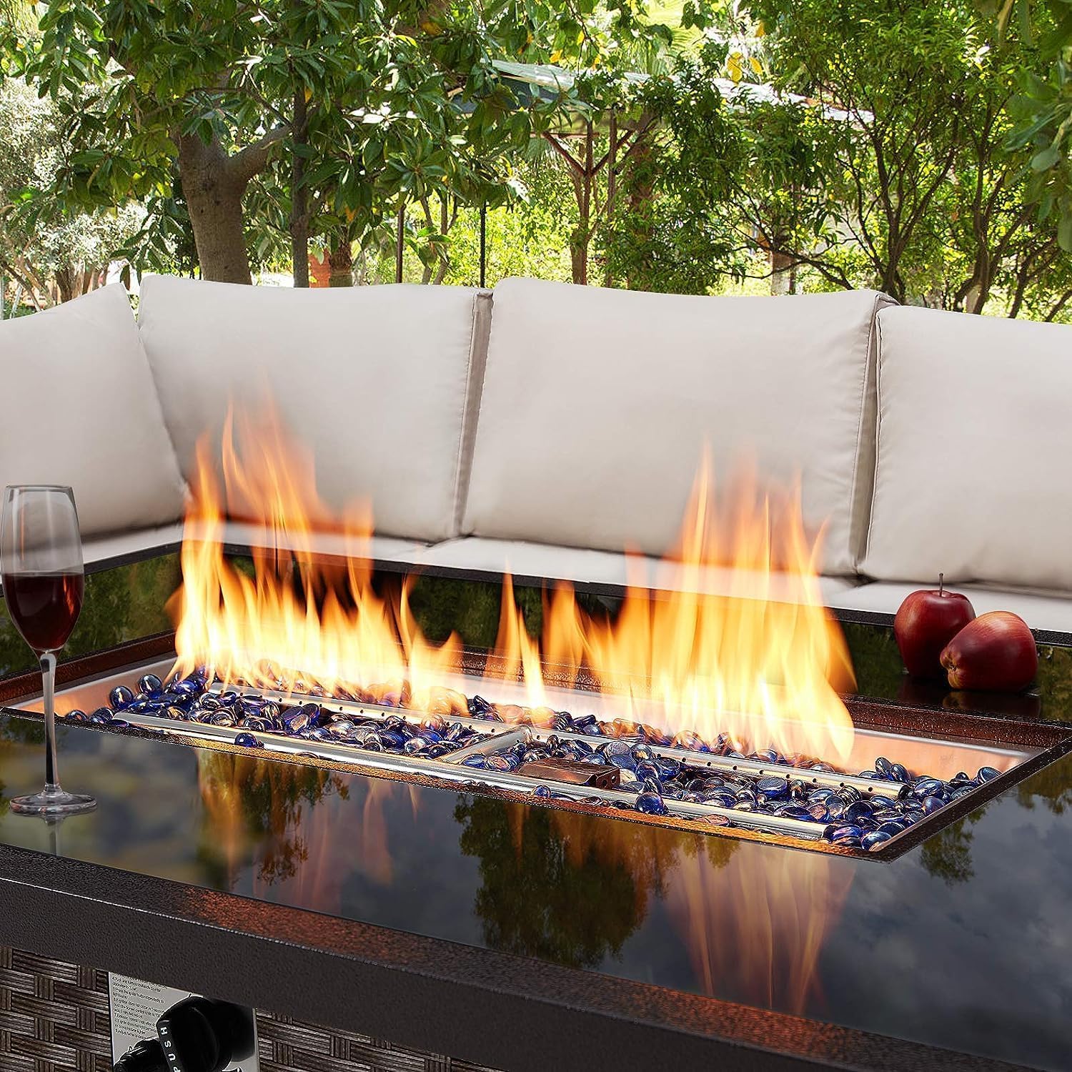 - 【Dimensions & Packing Included】: Overall Table Size: 43.25"L x 27.5"Wx 24.5"H, Unit includes: One Fire Pit Table with Burner Lid, Waterproof(Not Rain-Proof) Fire Pit Cover, Burner with pre-attached 2.4FT Hose & Regulator, Tempered Glass Wind Guard, 11 lbs Ocean Blue Decorative Glass Stone Set, Accessories Bag (Necessary Screws, Nuts & Washers), Product Manual.