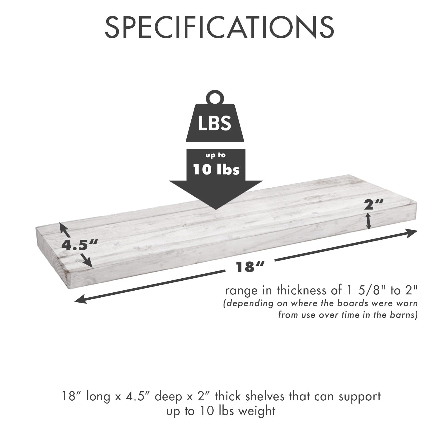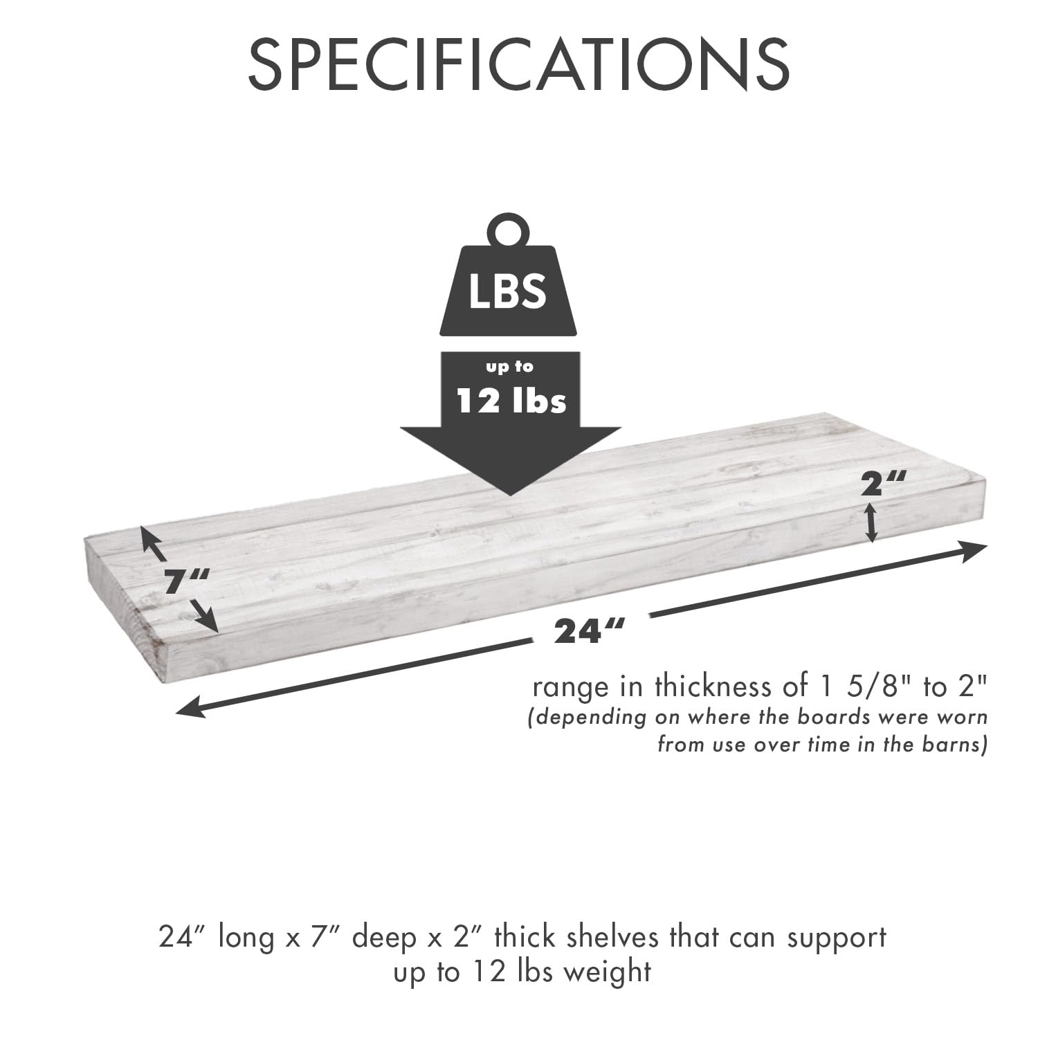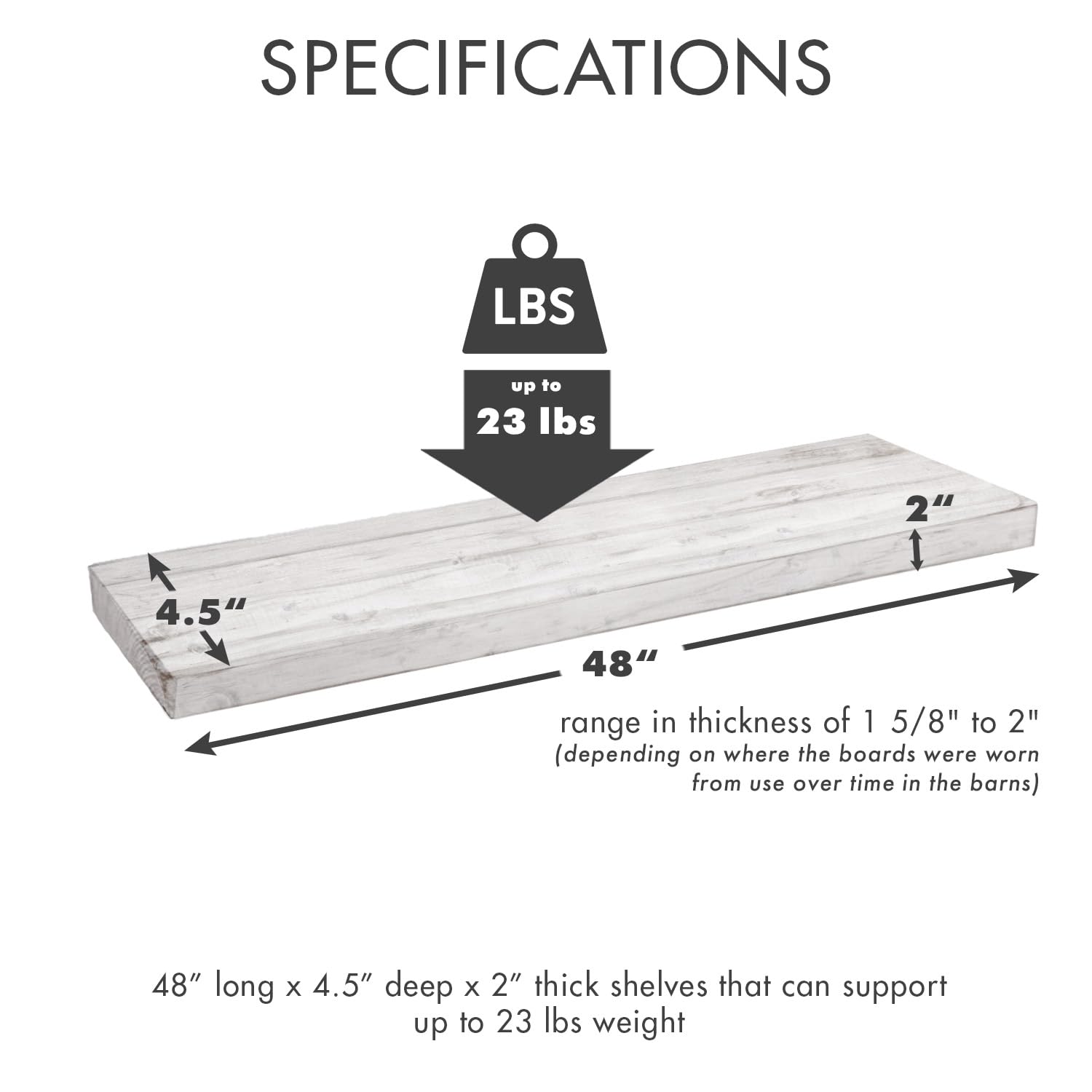 - VARIETY OF SIZES: Our rustic wood shelves range in size from an 18 inch floating shelf to a 48 inch floating shelf. Each of the reclaimed wood planks for shelves range in thickness from 1 5/8" to 2", depending on where the plank was used in the original barn. The reclaimed barn wood floating shelves are available in 4.5" and 7" depths.