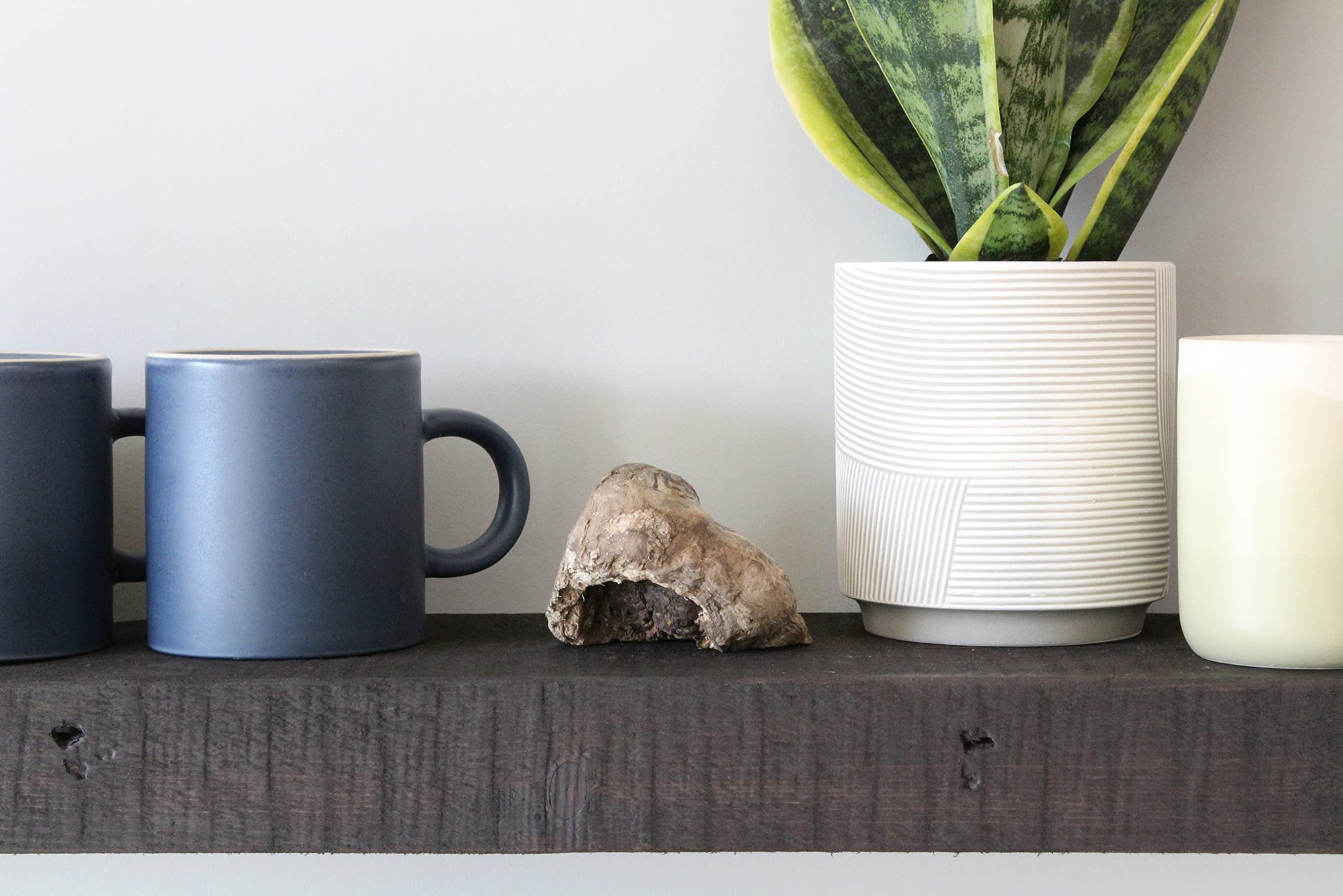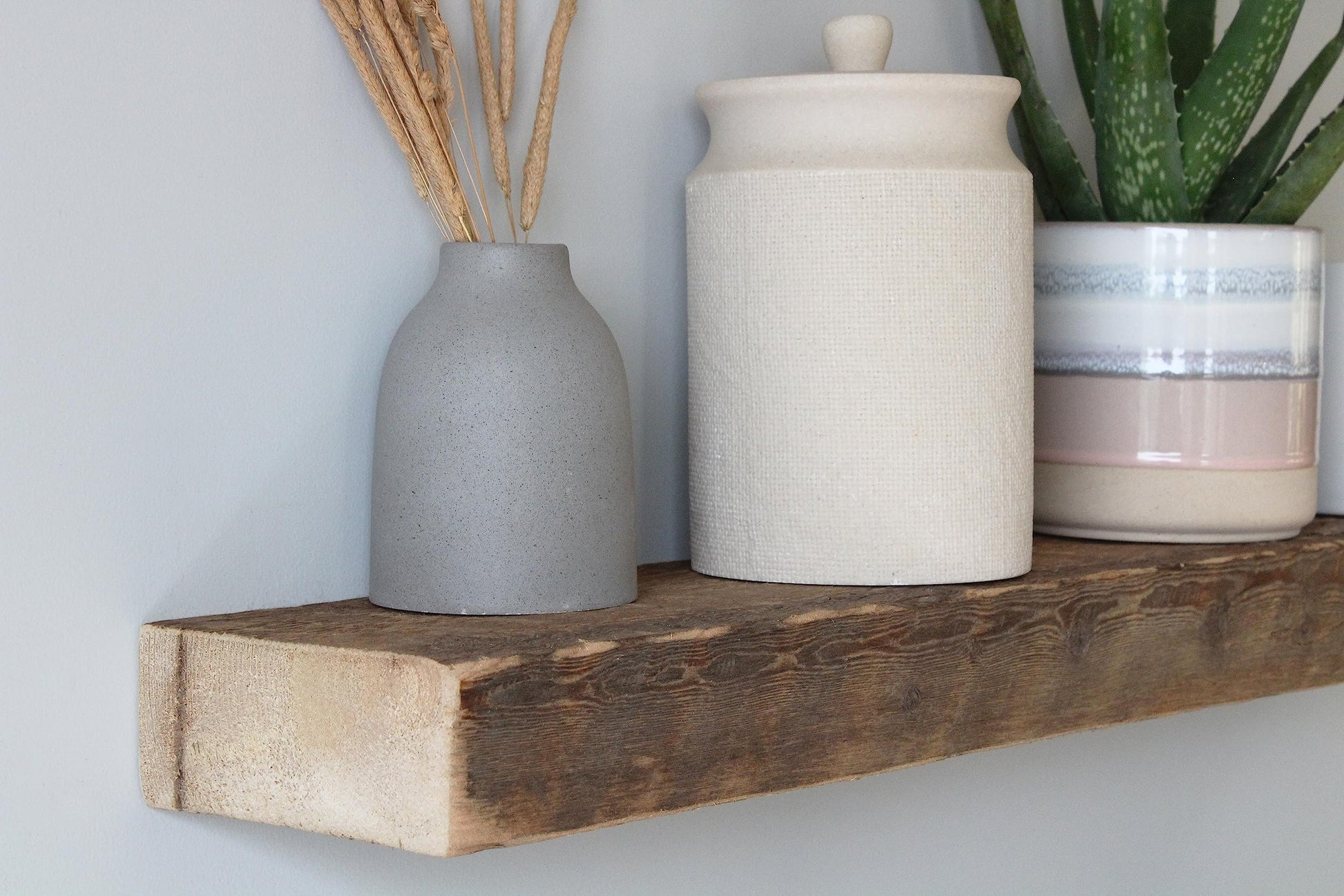 - MINIMALIST DESIGN AND RUSTIC ELEGANCE: Minimalist and rustic design come together in these rustic floating shelves. Built from reclaimed barn planks, they carry the nuances of rural living into your space. Our reclaimed wood shelf options include Natural wood floating shelves with no finish. We also offer a Coffee Bean stain for a darker look, or a White Wash finish that makes a beautiful white floating shelf.