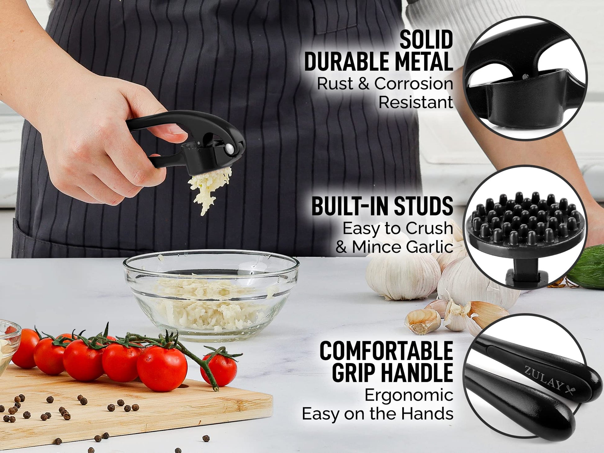 - HASSLE-FREE, ZULAY GUARANTEE: We love and take pride in our ginger and garlic press and back this up with a lifetime warranty. We offer an incredible value at a moderate price and are confident that you'll love our garlic grinder! PROP 65 WARNING: This product may contain chemical(s) known to the State of California to cause cancer, birth defects and/or other reproductive harm.